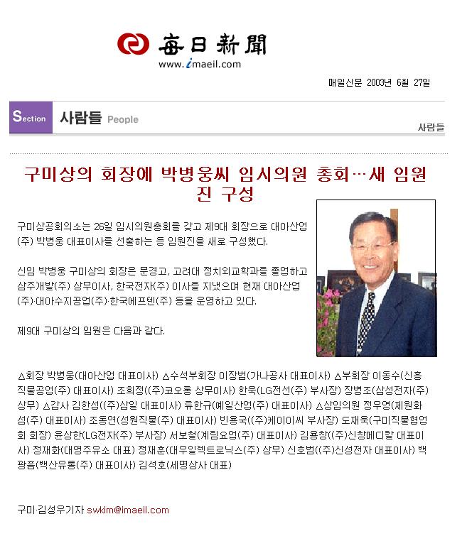 2003년 06월 27일 박병웅 회장 구미상공회의소 제9대 회장으로 선출 [매일신문]
